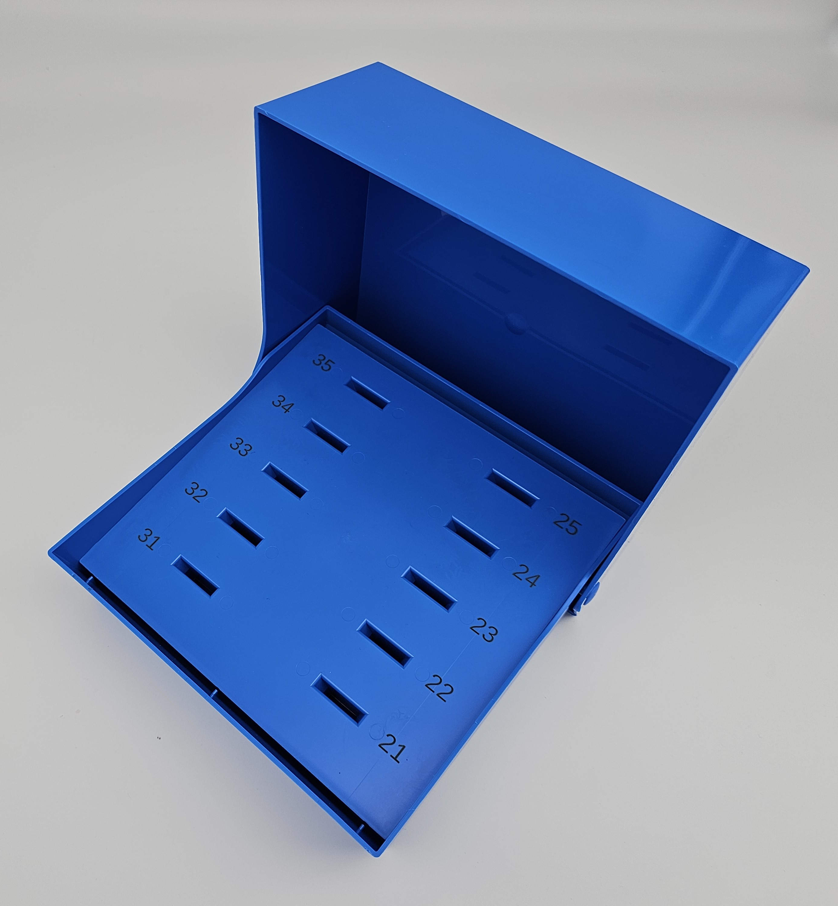 Aufbewahrungssbox mit blauem Deckel und 10 Implantat-OK-Löffel: 4112-10 / -11, -12, -13