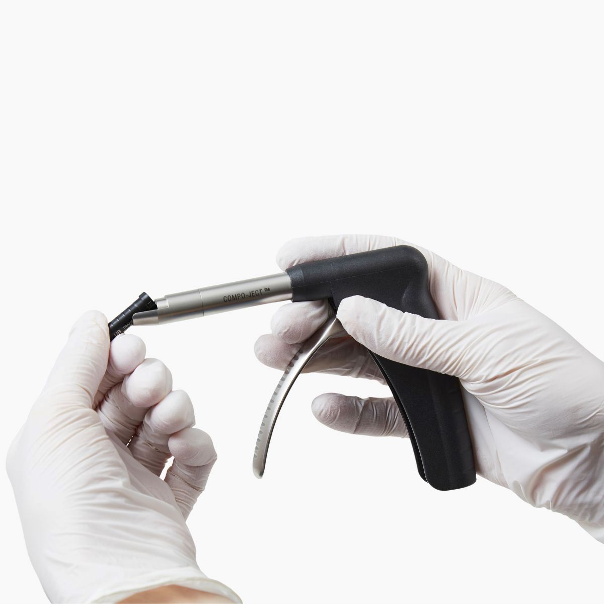 Der Applikator hat einen ergonomischen entworfenen Fingergriff mit einer Übersetzung, die es leicht macht hoch viskoses Composit-Material zu applizieren – sanft zu Hand und Handgelenk.