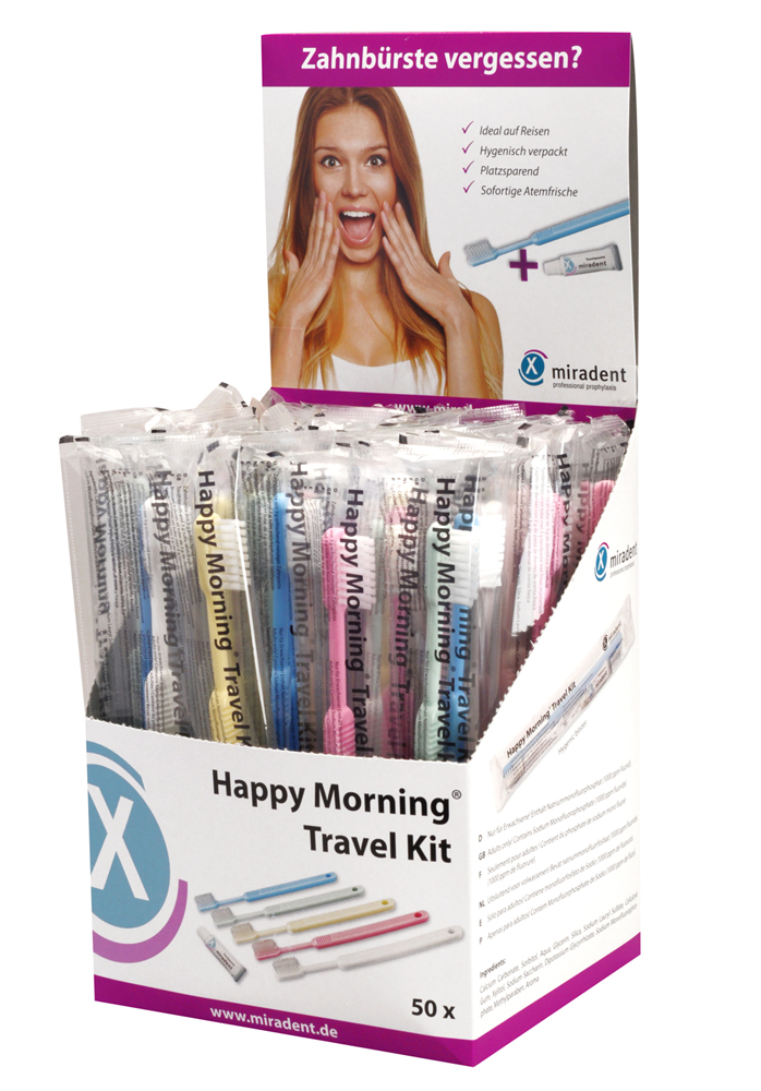 Happy Morning Travel Kit, Reisezahnbürsten inkl. 3-g-Zahnpasta, 50 Stück