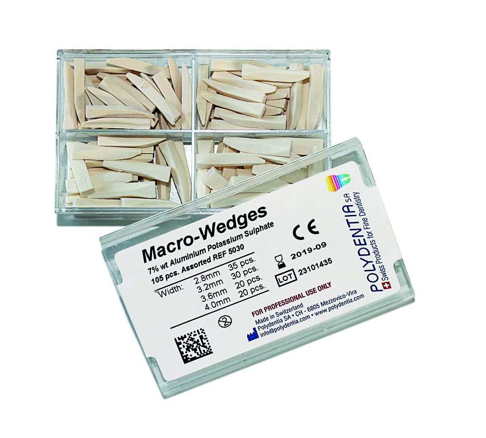 Bei breiten Interdentalräumen kann meistens kein Kofferdam gelegt werden. Auch hier sind die Macro-Wedges die Holzkeile der Wahl da sie mit Aluminiumkaliumsulfat imprägniert sind und somit eine astringierende Wirkung auf das Zahnfleisch haben. Macro-Wedges sind die ideale Lösung für alle Patienten und Paro-Fälle mit breiten Interdentalräumen zwischen den natürlichen Zähnen und Kronen oder Implantaten. Generell sind Macro-Wedges in allen Bereichen mit großen Interdentalräumen indiziert.