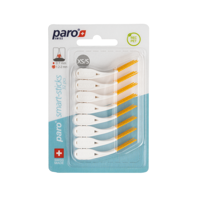 Die bruchsicheren und elastischen paro smart-sticks sind in den Größen XS/S, Ø: 1,2 - 2 mm (orange) und M/L, Ø: 1,5 - 3,8 mm (hellgrün) erhältlich und ermöglichen eine leichte Erreichbarkeit der Seitenzähne. Im Blister mit 32 Stück.