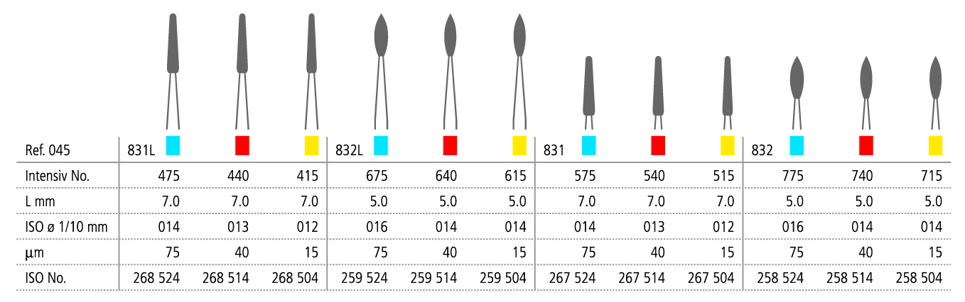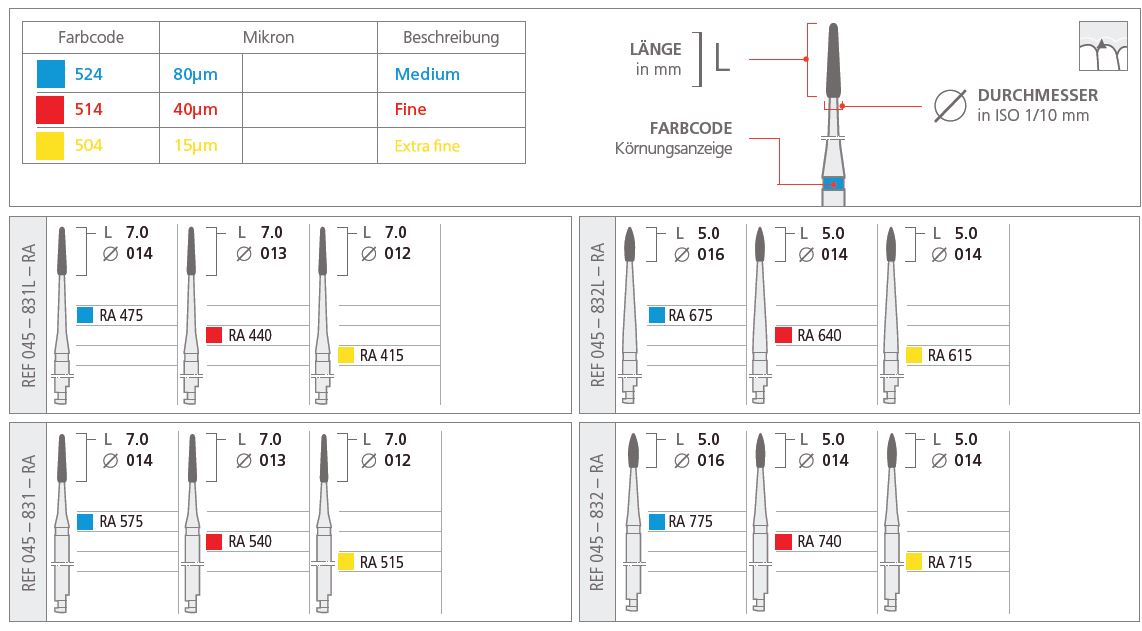 Die relativ groben, mit einer 75 µm-Diamantenkörnung belegten Instrumente dienen allein der Odontoplastik. Mit ihnen werden Furkationen und enge Wurzeleinziehungen erweitert. Mit den 40 µm-Diamanten kann die Depuration, d.h. die Befreiung der Wurzeloberfläche von Belägen und Zahnstein erfolgen.