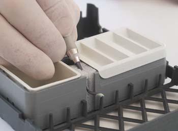 Schlitzförmige Einkerbung mit Schaumstoff zur schnellen Entfernung von Reste und Abfall (Debris) an Feilen, Bohrern und Handinstrumenten