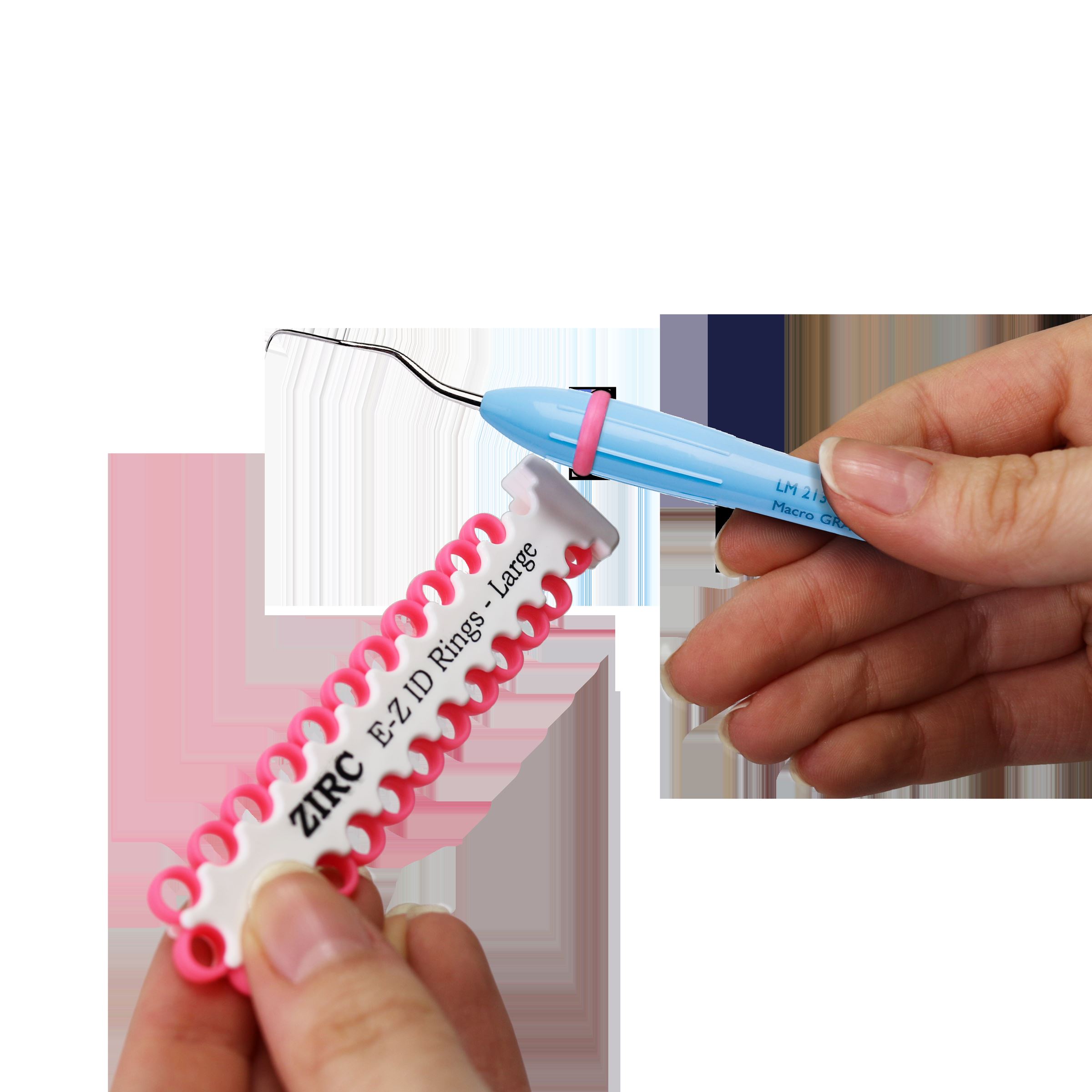 E-Z ID-Ringe können ganz einfach auf jedes Instrument aufgesetzt werden. Instrument im Spender durch einen E-Z ID-Ring führen, aus dem Spender lösen -> fertig!